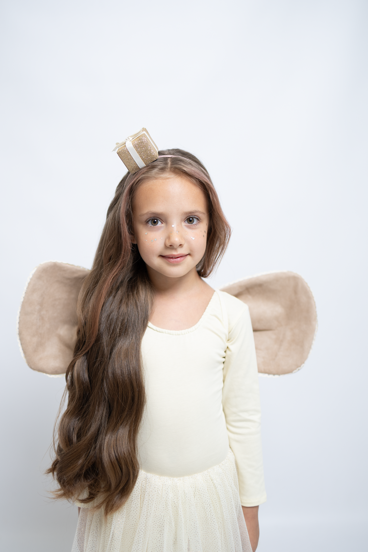 This enchanting headband presents a glittering gift package in rose gold, topped with an elegant bow made from ivory grosgrain ribbon and attached to a hoop wrapped in pink satin. Whether for birthdays, festive occasions or simply for a touch of everyday magic - it adds a playful and festive touch to any outfit.