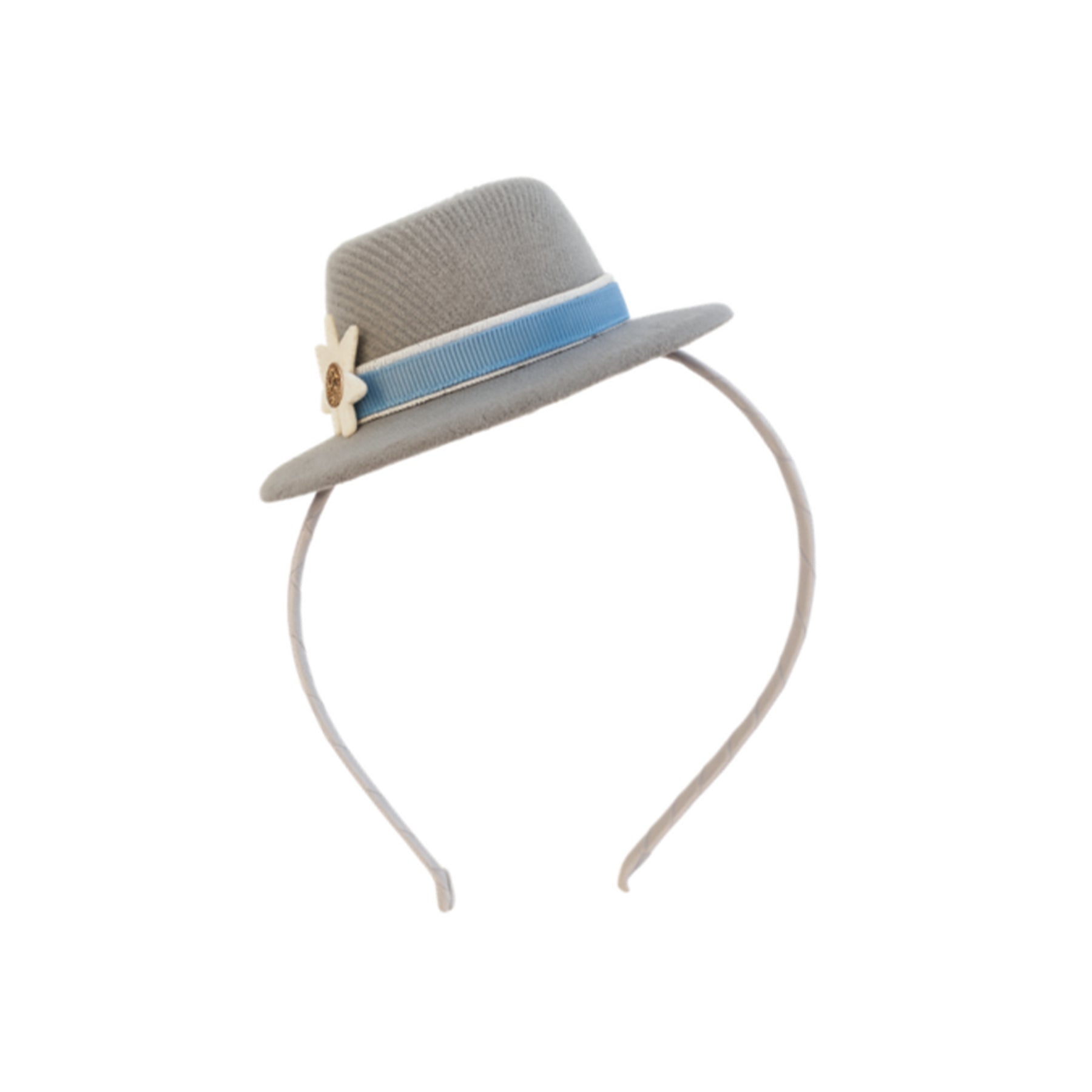 This adorable mini felt hat sits playfully tilted to one side, adorned with a sky blue ribbon and a sparkling edelweiss flower, attached to a softly wrapped hairband. It is the perfect alpine accent for little festival-goers, twirling dancers and yodeling queens.